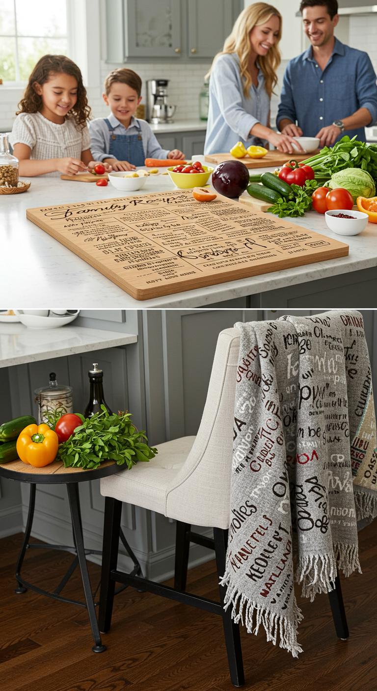 After wrapping up in that cozy customized name blanket, it’s time to head into the kitchen with a unique gift that brings family traditions to life: a family recipe cutting board.