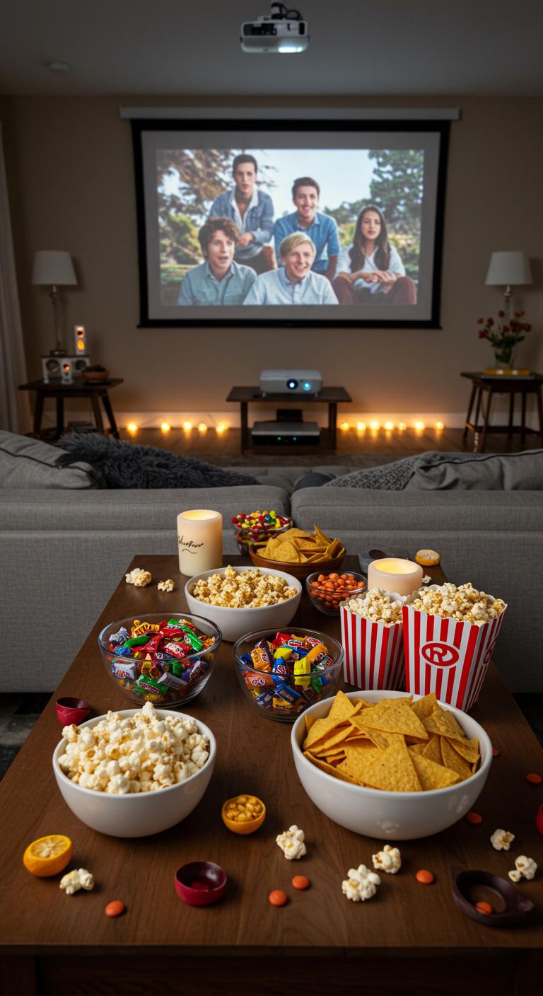 Include a selection of family-friendly films, so everyone can pick their favorite. Pair it with fun movie snack ideas like popcorn, candy, and nachos for an unforgettable experience.