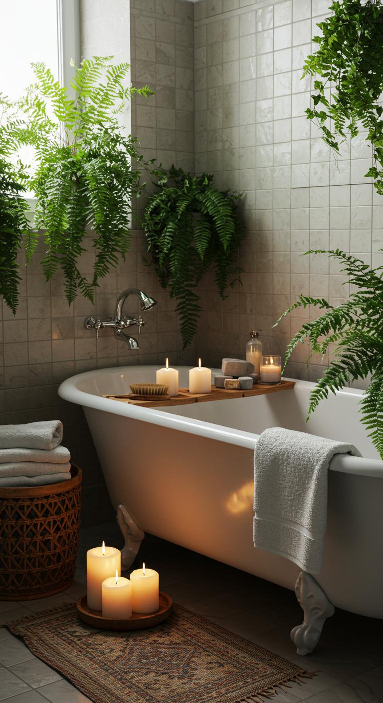 Add soft, scented candles and a few plants like lavender or ferns. This not only purifies the air but also promotes relaxation. Use local herbs or flowers for DIY bath products.