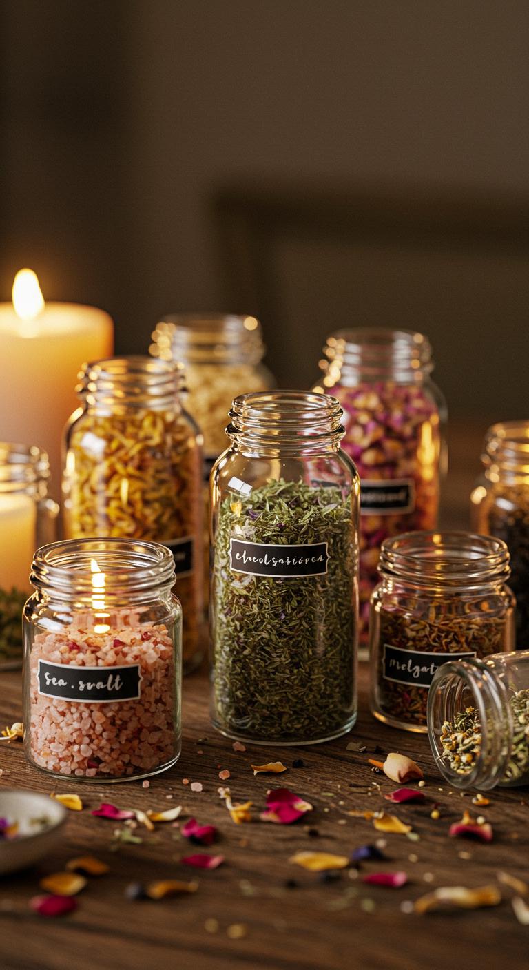Use small glass jars or repurpose old mason jars. Fill them with layers of materials that correspond to your spells. For example, combine rosemary, lavender, and a small citrine for abundance spells.