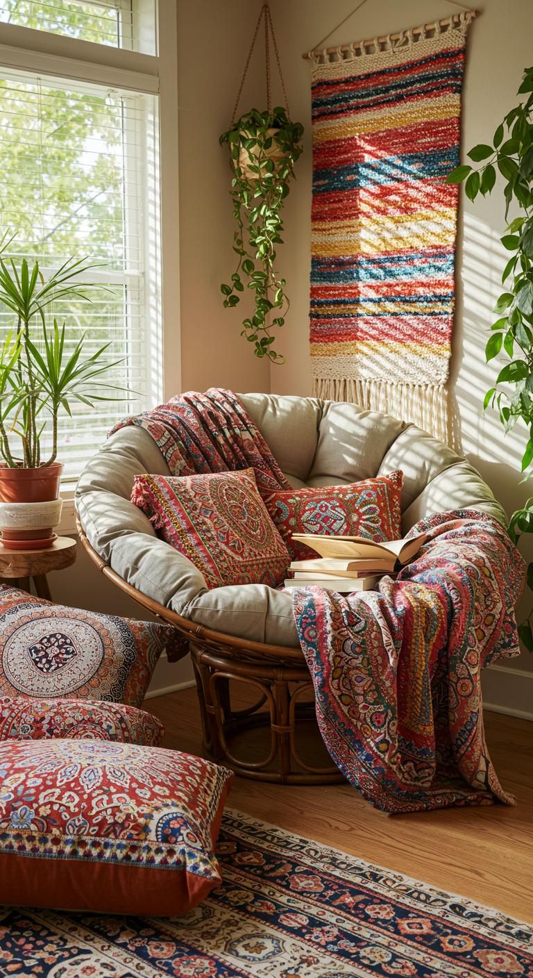 Drape a tapestry on the wall to create a focal point. Choose earthy tones or celestial patterns to capture the essence of nature. Use vibrant cushions to add comfort and warmth.