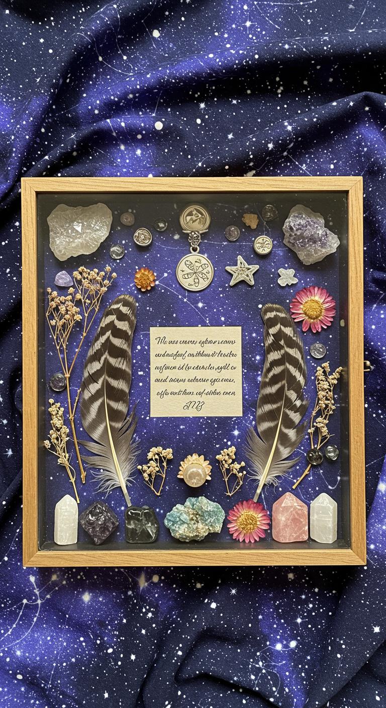 Choose a shadow box in a vintage style. Arrange your treasures to tell a story, layering items for depth. You can paint the box in dark hues or wrap the edges with twine for added charm.