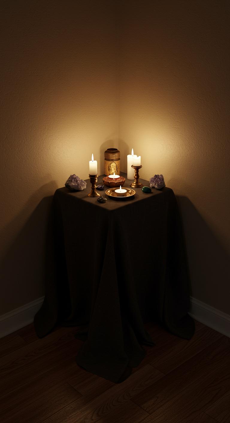 Use a beautiful cloth as a base, then arrange candles, crystals, and items of personal significance. This can be seashells from the beach or stones collected from special places.