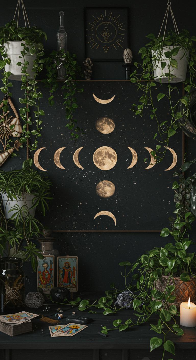 - Moon Phases: Hang wall art or a calendar that tracks moon phases, which is not only decorative but also embodies the spirit of witchcraft.