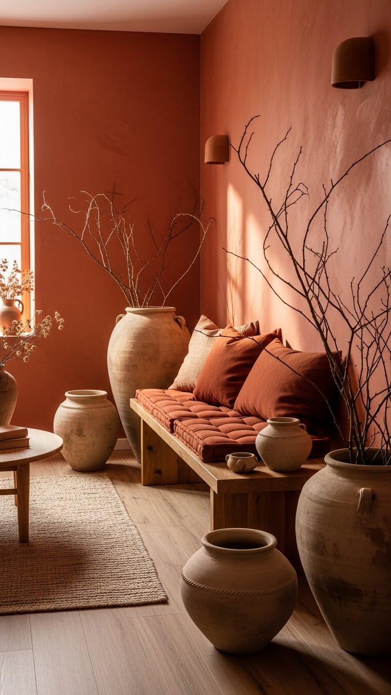 Think about rust and clay colors. They add a natural feel to your home. Use them on walls or pillows. Start small. Paint a single accent wall with terracotta shade. A sample pot costs around $5. It changes the room fast. Pair it with greens for balance. Add houseplants from your local store. They cost less than $10. Place them in corners. This brings life indoors. Go for DIY. Collect branches from outside. Put them in a vase. It mimics nature without spending much. Focus on family areas. These tones make spaces welcoming. Try a rust throw over your chair. You might already have one. Layer textures carefully. Mix in a jute mat under the coffee table. Cut an old one to size at home. Use scissors and tape. These steps are easy. They create a grounded vibe. Update pillows with earthy fabrics. Sew covers from scrap cloth. It takes minutes. You’ll feel the warmth right away. Keep actions affordable. (Word count: 200)