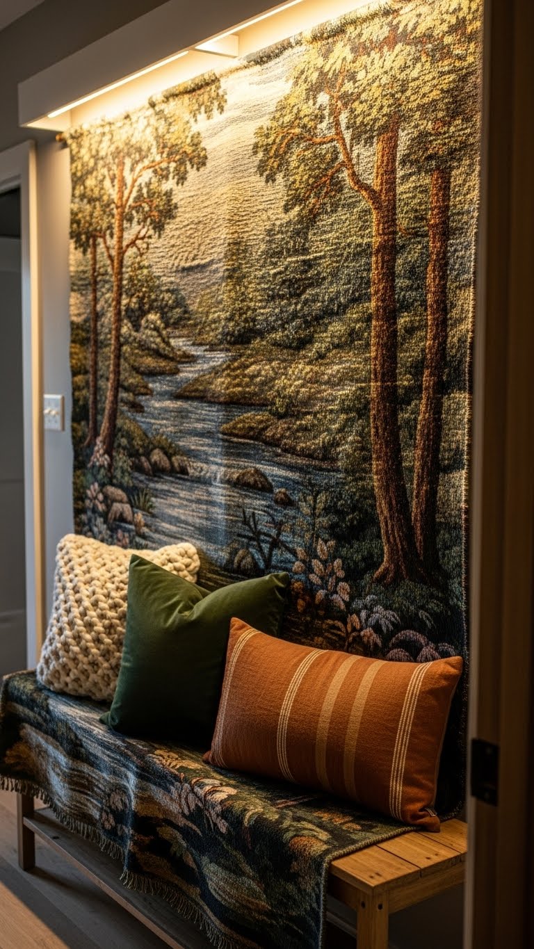 Tapestries and rugs on walls bring texture. Start with a small one. Hang an old scarf as decor. Use thumbtacks you have. It adds depth fast. Cover bare spots. Drape a rug over a frame. Find one in your closet. Attach with hooks. This is easy DIY. Focus on sound. Textiles absorb echoes. Place them in noisy rooms. Cut fabric to size. Sew edges with thread. Costs under $2. Layer for effect. Add pillows below the textile. Arrange from your collection. These steps warm spaces. Try in bedrooms. Hang a blanket tapestry. Pin it simply. You’ll notice the change. Keep it affordable. Use what you own. Update one wall at a time. Make it personal. (Word count: 200)