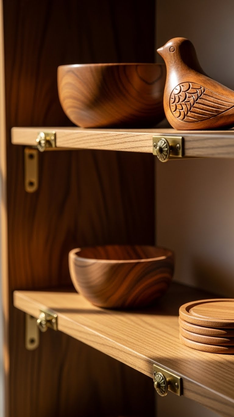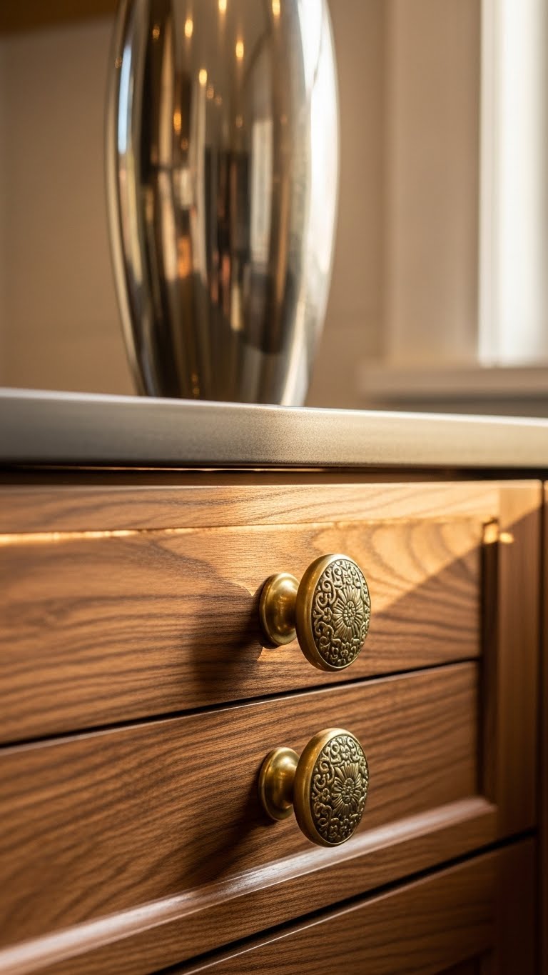 Brass and wood create contrast. Start with knobs. Swap for brass ones. Cost $4 each. Attach to cabinets. It pops details. DIY pairings. Sand wood pieces. Place with brass. This is straightforward. Focus on neutrals. Use in storage. These enhance setups. Try in kitchens. Add wooden trays. Set with brass. Layer for effect. The mix stands out. Keep it affordable. Shop deals. Change one pair. Make decor shine. (Word count: 200)