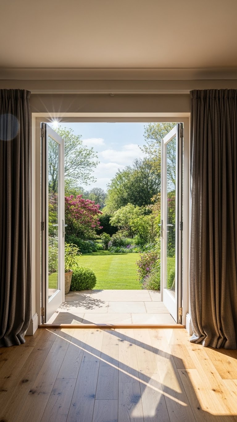 Bigger doors let in light. Consider bifold options. Measure your space first. Install temporary ones with clips. They cost around $20. This connects indoors. DIY shades. Hang fabric panels. Use rods you own. It adds privacy. Focus on cozy spots. Open doors to views. Prop them wide. These enhance setups. Try in family areas. Add textured mats inside. Place them near entries. Layer for comfort. The result feels open. Keep actions simple. Use existing doors. Update as needed. Make light a priority. (Word count: 200)