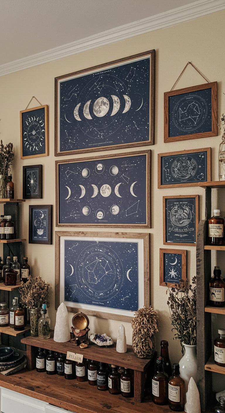 Celestial themes offer a whimsical touch to your office. Start by sourcing affordable prints or DIY your own using online templates. Think images of the moon phases, stars, and astrology signs. Frame these in mismatched vintage frames for a cozy, eclectic look. Hang them above your desk to inspire dreamy ideas. Consider painting a celestial mural for a bolder statement. For an even cozier vibe, use string lights to illuminate the art gently.