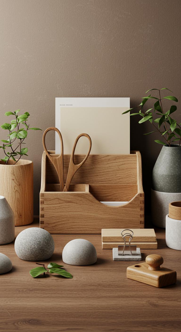 Bring nature into your workspace with desk accessories made from natural materials. Wooden organizers, stone paperweights, and woven baskets can enhance the witchy vibe. Look for these at local craft fairs or online shops. You could also create your own using materials from nature. Use twigs for pencil holders or pebbles for paperweights. Adding a few greenery touches such as mini plants ensures a lively and earthy workspace.