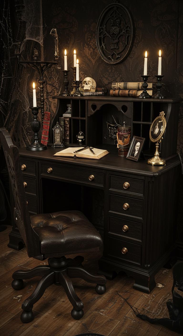 Look for gothic-style furniture pieces to enhance your witchy vibe. A dark wood desk or a beautifully carved chair can serve as a stunning centerpiece. You don’t need to splurge; check out thrift stores for vintage finds or DIY refinishing older pieces. Add mystical symbols using stencils or paints, allowing for a personal touch. This can set an enchanting tone for your workspace.