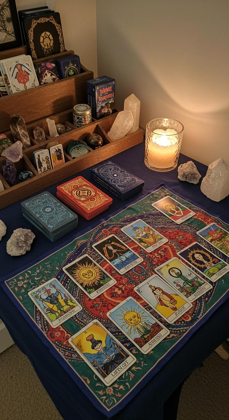 Establish a tarot corner in your office to inspire creativity and intuition. Select a comfy chair and small table for your reading space. Arrange your tarot cards along with some crystals and candles. You can find inexpensive tarot decks online or even DIY your own using cardstock. Use a decorative cloth to enhance the vibe. Spend a few moments each day drawing cards. This practice can spark new ideas and provide clarity for work projects.