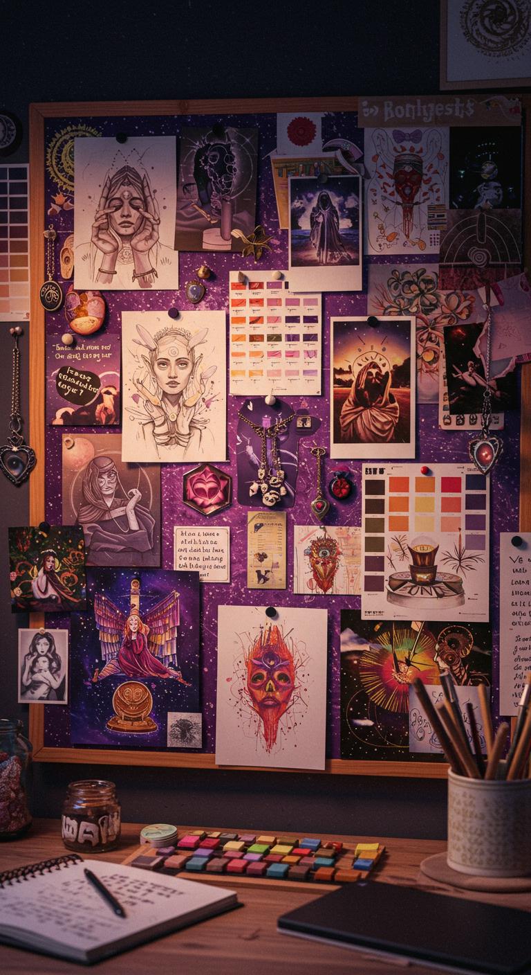 Create a mood board for your office to visually represent your aspirations. Pin inspirational quotes, images, and fabrics that resonate with your goals. Include witchy themes like moon phases or nature scenes. You can easily craft this using a corkboard or canvas from your local craft store. Hang it near your workspace for daily inspiration. This personal touch keeps your dreams front and center and encourages creativity.