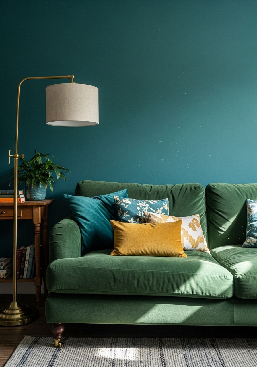 I painted one wall Benjamin Moore Hale Navy and layered emerald and rust accents. Velvet makes jewel tones feel indulgent but cozy. I added emerald velvet throw pillows ($24) and a brass arc floor lamp ($129). A small oriental-inspired rug, 5×8 ties warm and cool tones. Styling tip: keep wood tones consistent. Mistake to avoid: over-accessorizing metallics — one or two brass pieces read intentional, not gaudy.