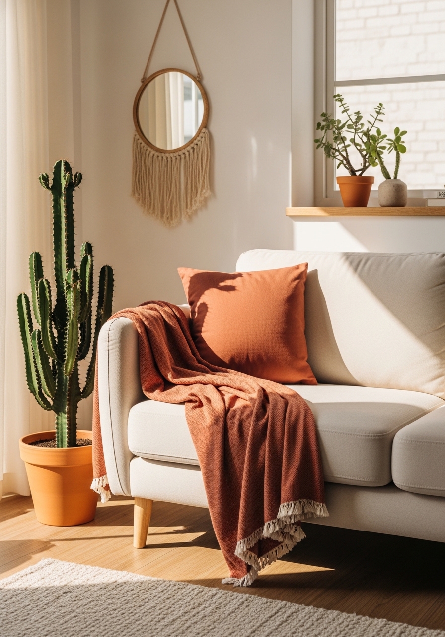 I used terracotta pillows and a cream wool throw to add warmth without heavy pigment. I bought a terracotta throw 50×60 ($34) and cream chunky knit throw 50×60 ($39). A clay planter 10in brings the palette full circle. Styling tip: layer warm and neutral textures. Mistake to avoid: using terracotta with cool grays — they fight.