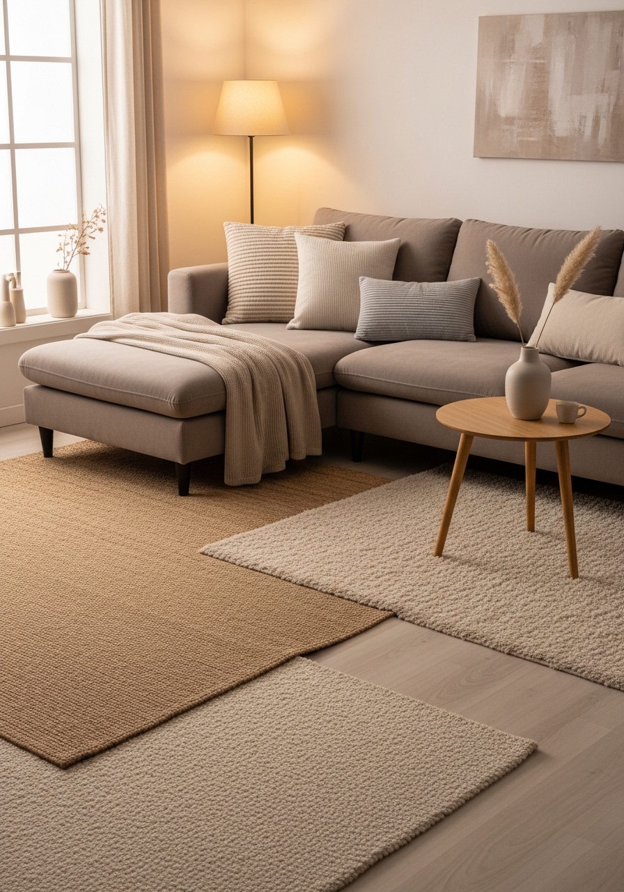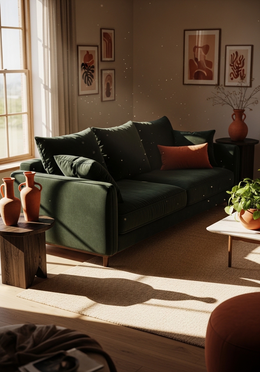I used a black-green sofa and sand-colored rugs to create a warm desert palette. I added sand jute rug 8×10 ($179) and black-green pillow 20×20 ($24). A terracotta vase set complements the tone. Styling tip: a single sculptural plant works best. Mistake to avoid: too many small plants that clutter.