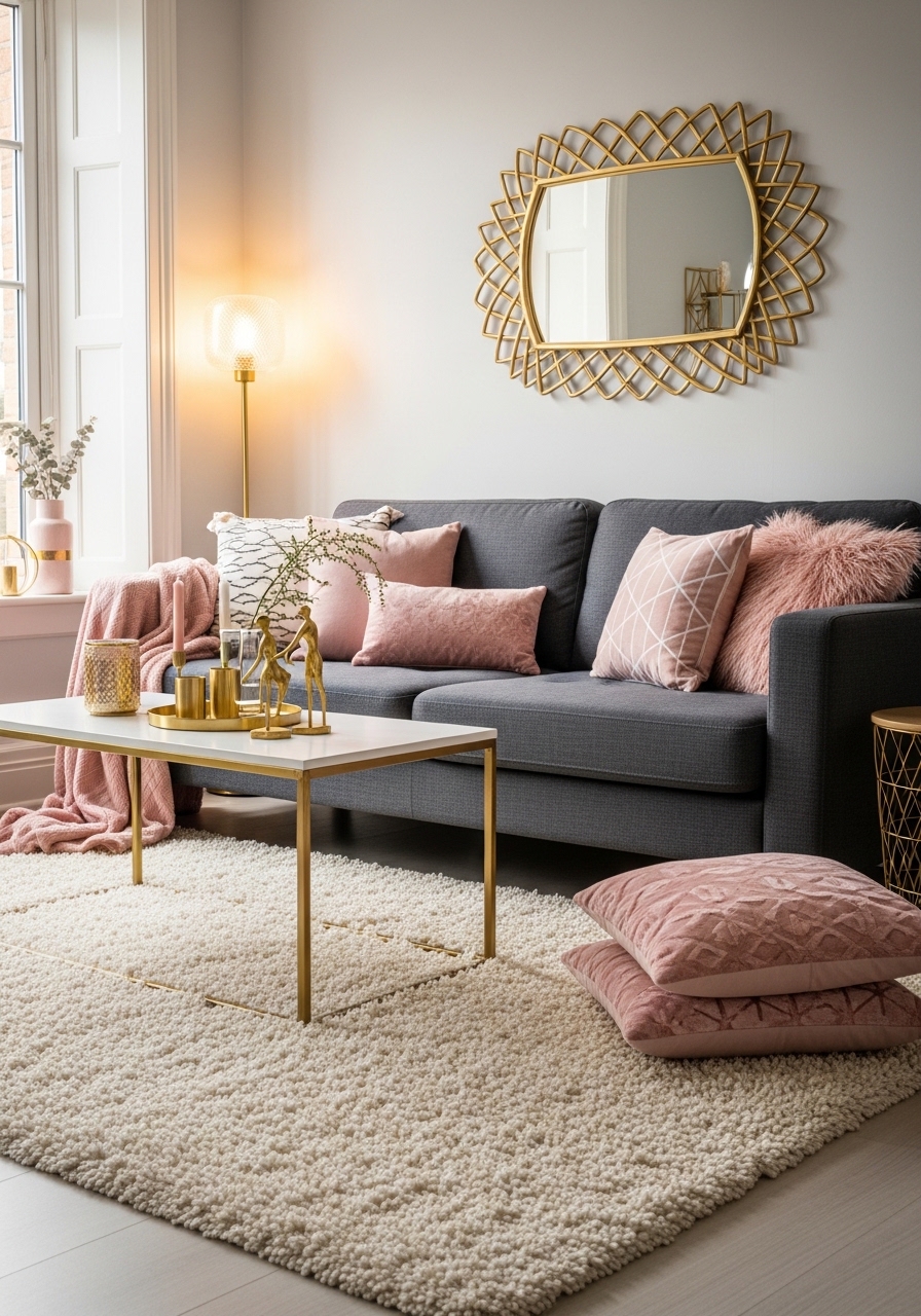 I combined charcoal upholstery with blush accents for balance. I used blush velvet pillow 18×18 ($20) and a charcoal throw 50×60 ($29). A gold side table 18in introduces sparkle. Styling tip: include one reflective surface. Mistake to avoid: mixing warm and cool metals without intent.