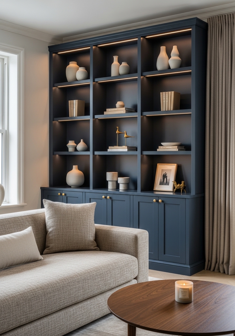I had the built-ins painted navy and softened the space with beige upholstery. I added beige lumbar pillow 14×24 ($18) and curated ceramic vases set ($35). A soft beige area rug 8×10 ties it together. Styling tip: keep shelf styling asymmetrical for interest. Mistake to avoid: overcrowding shelves; leave negative space.