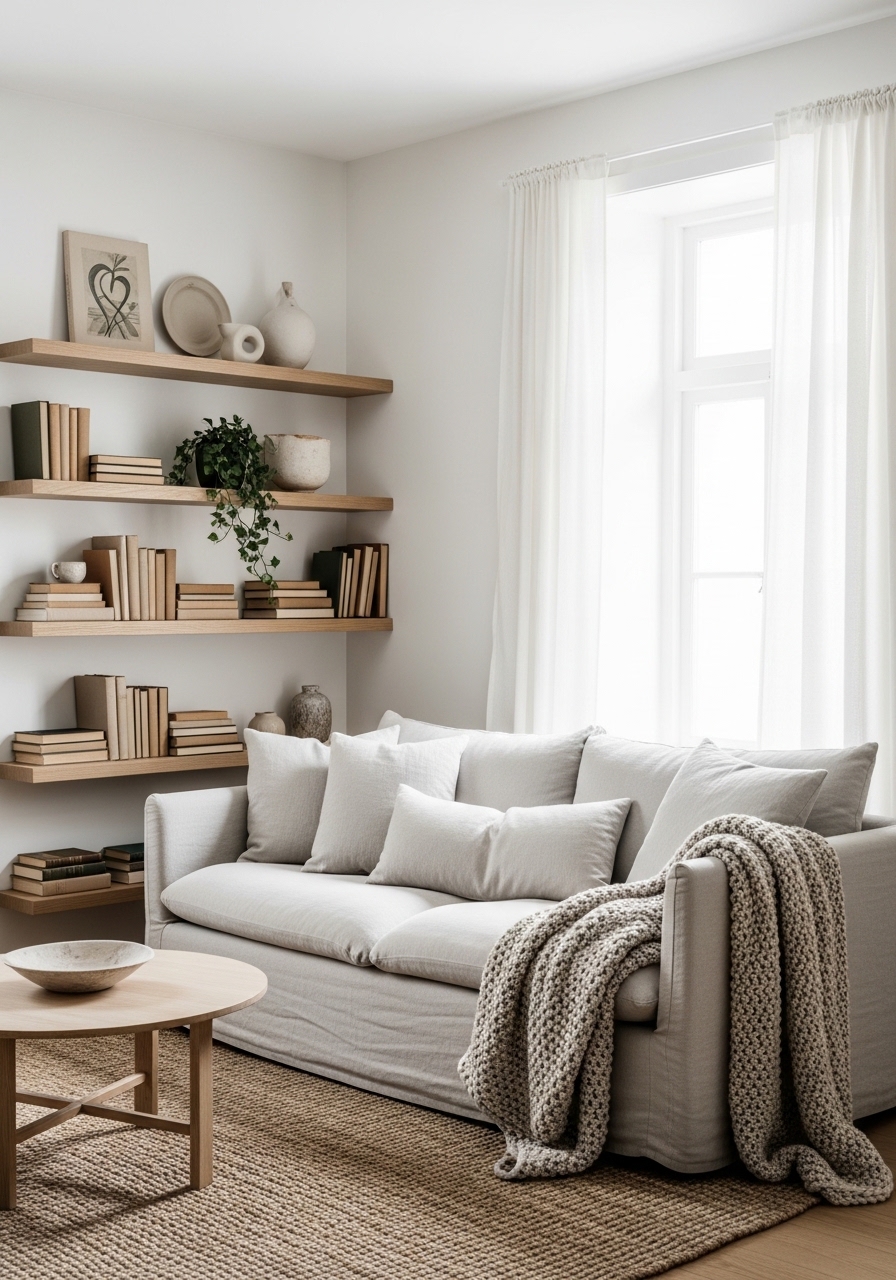 I used a warm-tinted white (Benjamin Moore Simply White with a hint of greige) and oak furniture. I added oak floating shelf 36in ($45) and linen sofa slipcover ($89). A soft white cotton rug 6×9 keeps it airy. Styling tip: repeat oak in two places. Mistake to avoid: pure white paint that reads sterile.