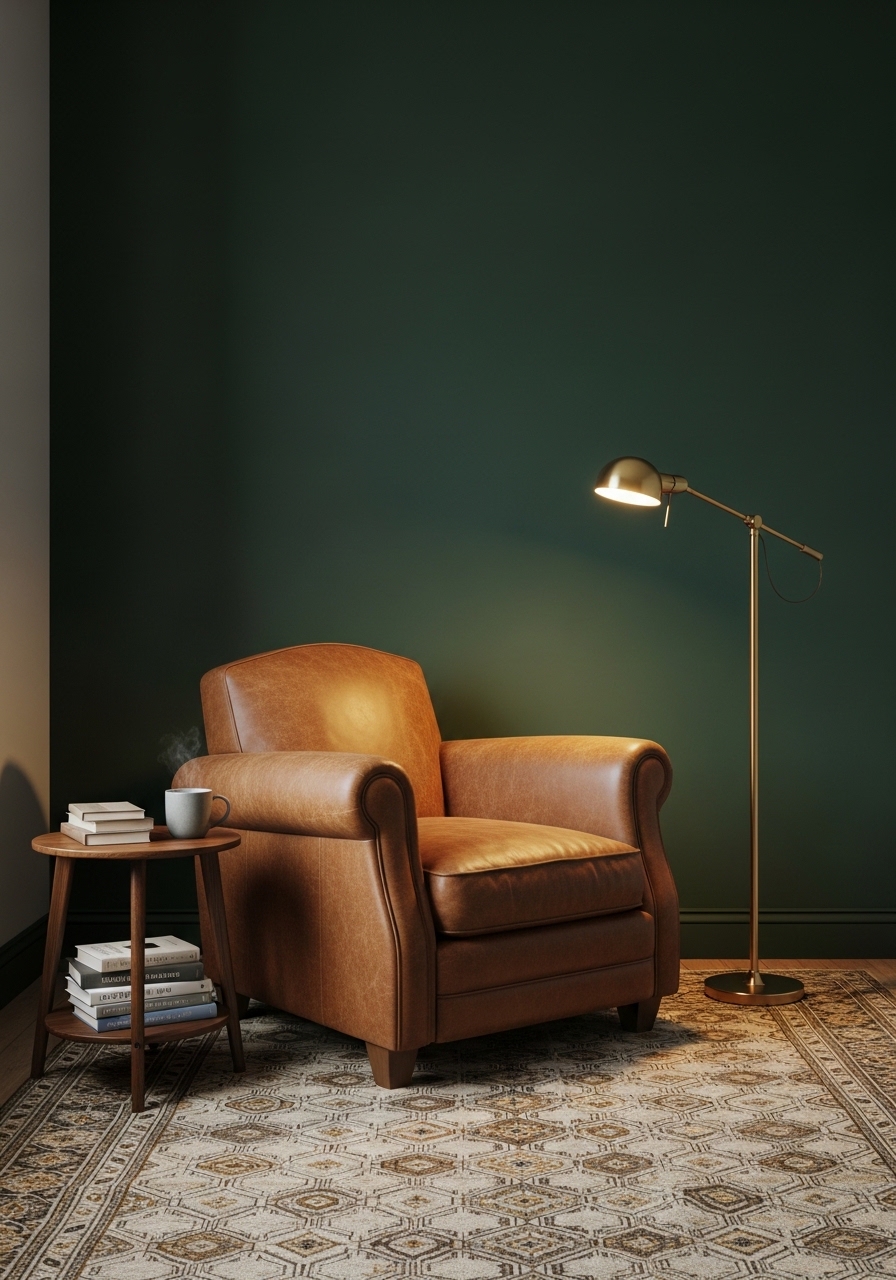 I painted a wall dark forest green and added brass accents. I used green velvet pillow 22×22 ($28) and a brass floor lamp ($129). A leather ottoman 18in brings texture. Styling tip: layer one patterned rug under a neutral rug. Mistake to avoid: adding more dark colors without a light anchor.