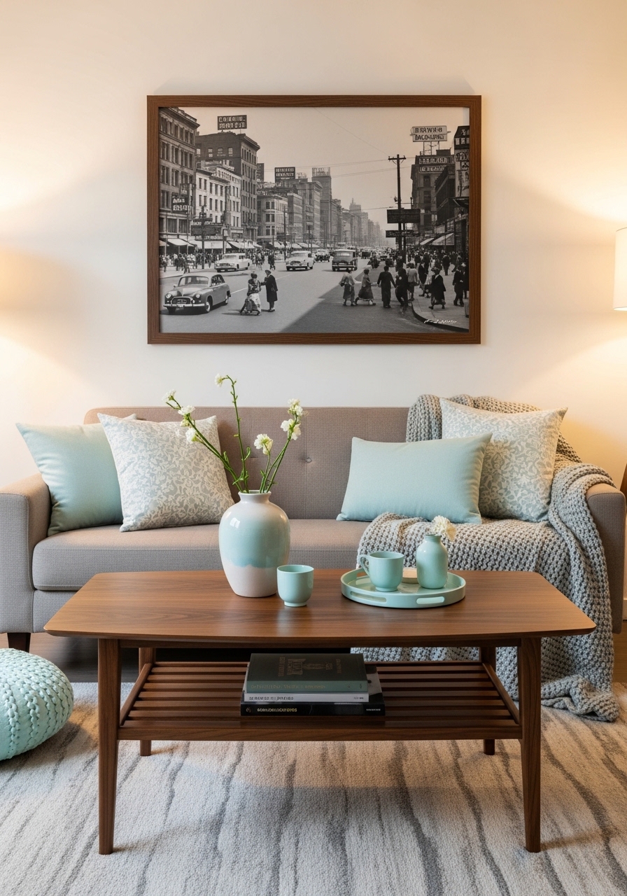 I used pale aqua cushions against a neutral sofa and walnut wood furniture. I bought aqua throw 50×60 ($29) and a walnut coffee table 42in ($199). A retro clock wall art finishes the look. Styling tip: balance vintage with one modern accessory. Mistake to avoid: mismatched wood tones.