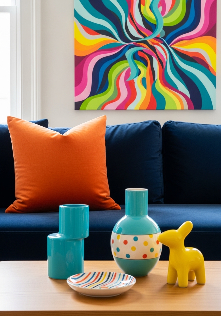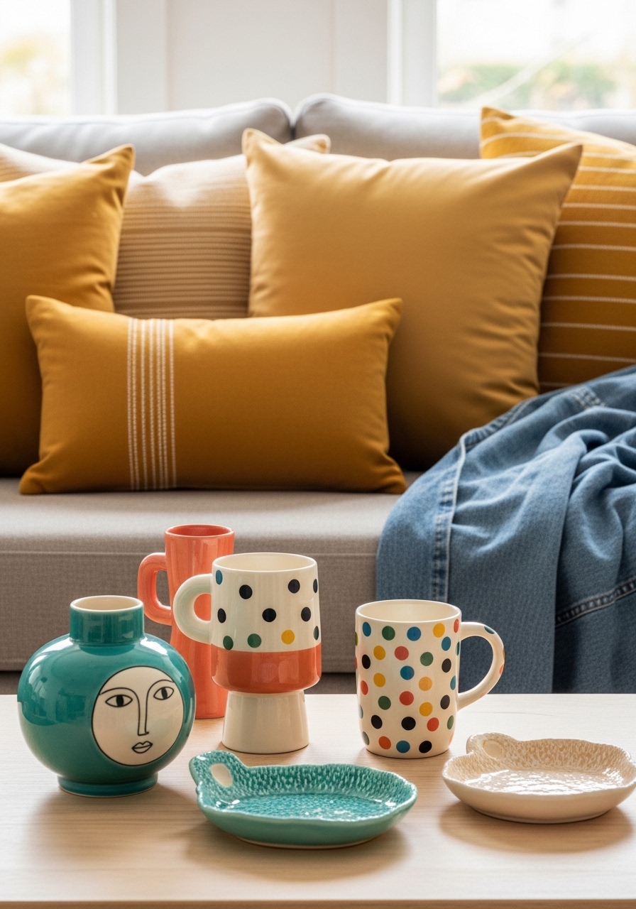 Tangerine accents on a navy base feel bold and cheerful without being juvenile. I used tangerine pillow 18×18 ($15) and navy cotton throw 50×60 ($22). A colorful ceramic set brings play. Styling tip: limit bright colors to 2–3 items. Mistake to avoid: adding another competing bright color.