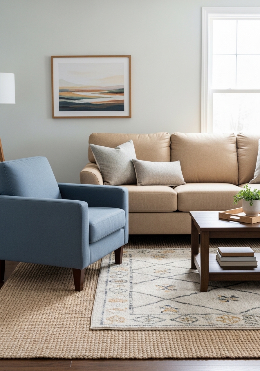 Slate blue chairs anchor the room while warm beige upholstery keeps it calm. I added slate blue accent chair ($199) and beige lumbar pillow 14×24 ($18). A neutral 8×10 rug completes the look. Styling tip: anchor blue with a dark wood piece. Mistake to avoid: pairing slate with cool chrome — choose warmer metals.