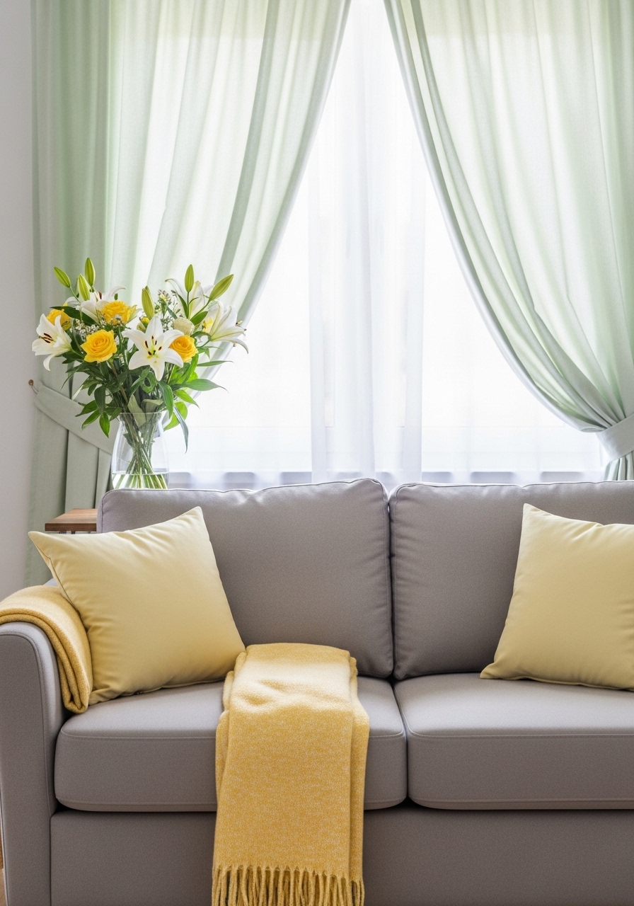 I used a cool medium gray and popped lemon in pillows and a small lamp. I chose lemon throw pillow 18×18 ($17) and a gray cotton throw 50×60 ($22). A yellow ceramic accent lamp finishes it. Styling tip: use yellow sparingly to energize. Mistake to avoid: using neon yellows; opt for muted lemon.