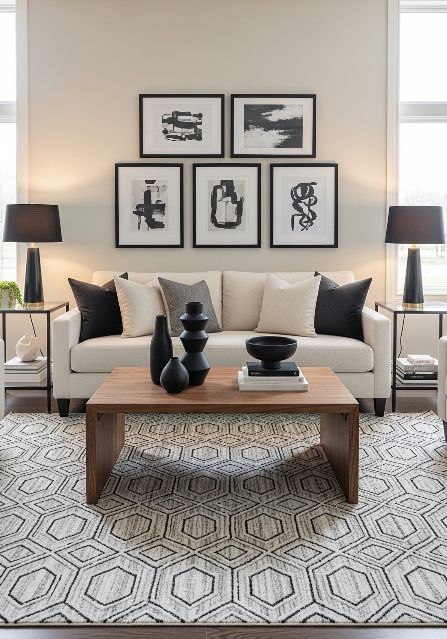Cream upholstery, walnut furniture, and black accents create a classic palette that never tires. I used a walnut coffee table 48in ($249) and cream wool throw 50×60 ($39). Add black picture frames set. Styling tip: keep patterns subtle and scale large. Mistake to avoid: mixing light and dark woods.