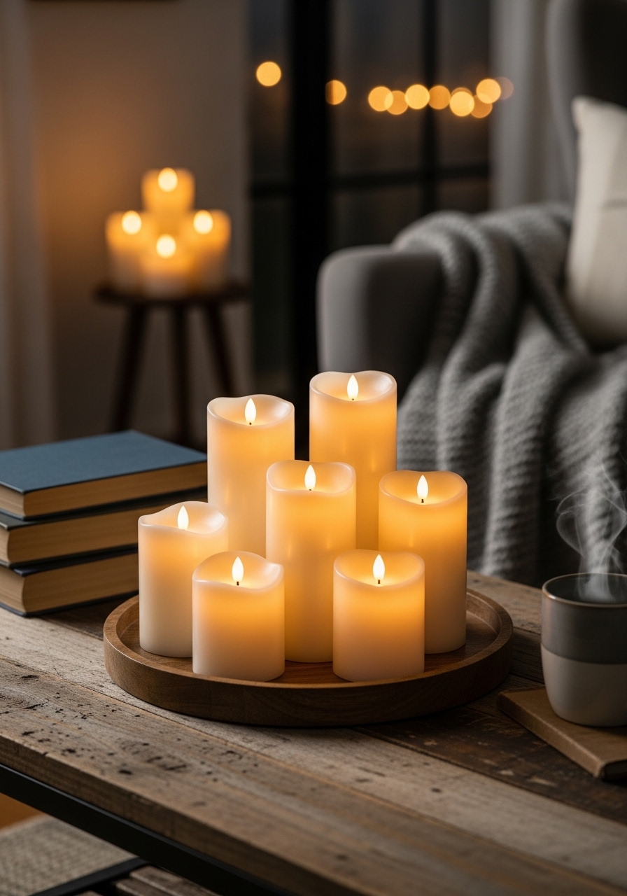 I group flameless pillar candles on a tray for safe, low light. I use Yankee-style flameless pillars with timers. The flicker is restful and kid-friendly. Styling tip: mix heights in odd numbers. Mistake to avoid: placing real candles near curtains — fire risk.