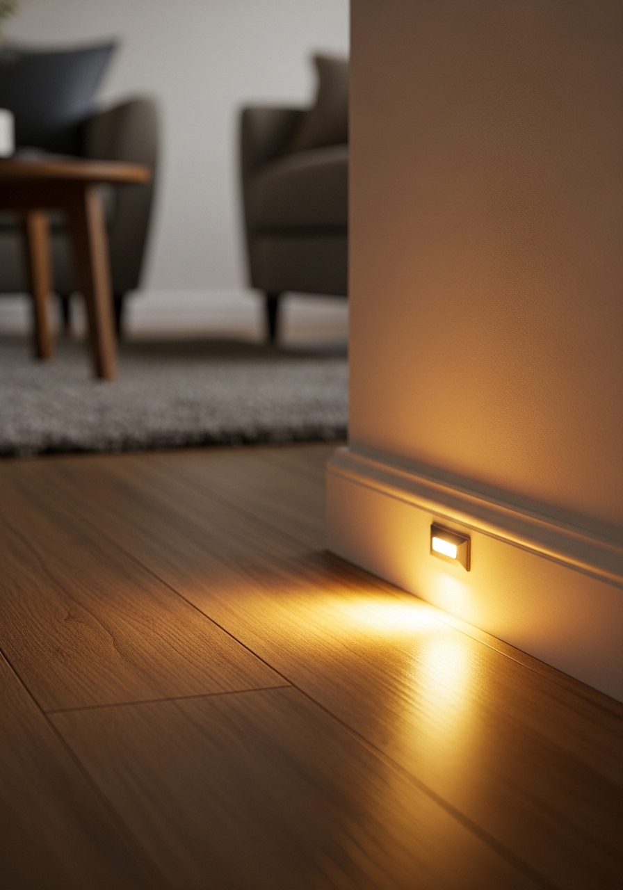 I installed low-profile motion lights along the path to the kitchen. I picked battery motion LED puck lights. They guide the way without turning on big lights. Styling tip: set to warm white. Mistake to avoid: placing them too close together — creates bright patches.