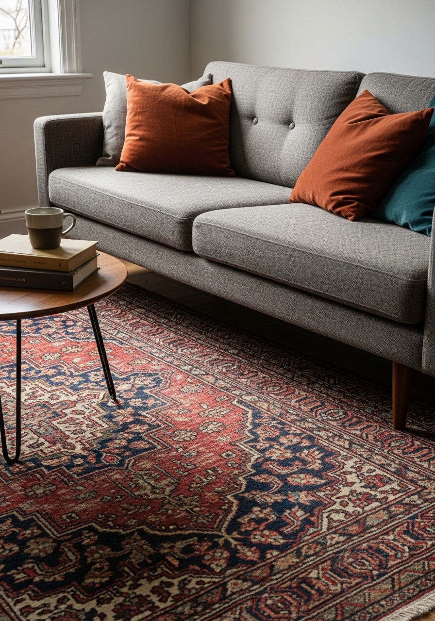 I love the lived-in feel of a faded Persian look. It adds history and hides wear. I chose a 8×10 distressed red/navy piece. Try 8×10 vintage-style rug or distressed Persian look rug. Styling tip: pull one color from the rug for pillows. Mistake to avoid: pairing a busy rug with busy wallpaper — it competes too much.