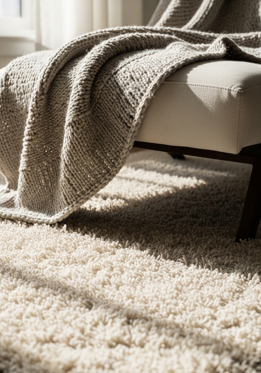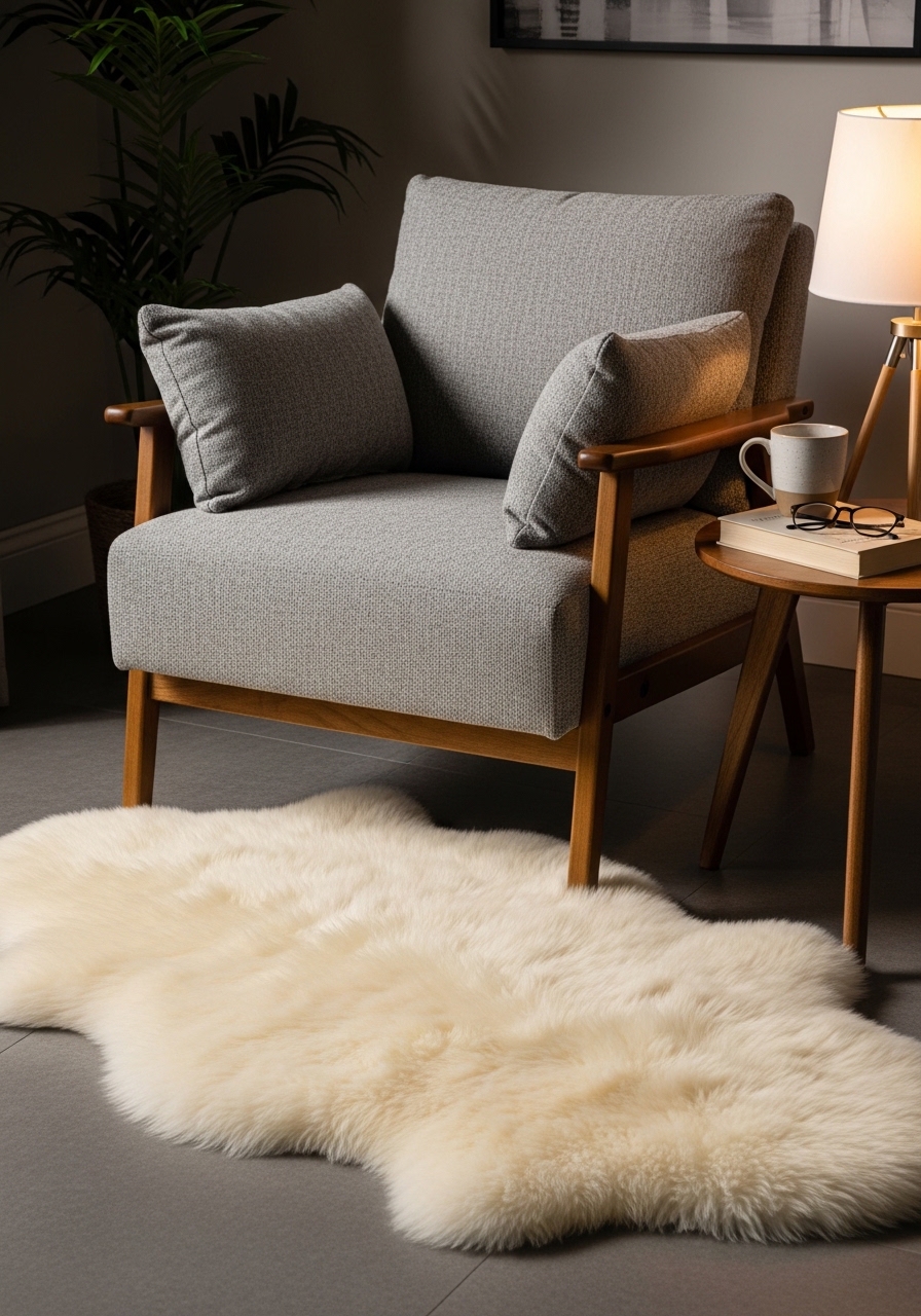 I tossed a 3×5 faux sheepskin under my armchair. The texture is tactile and inviting. Try 3×5 faux sheepskin rug and matching footstool cover. Styling tip: keep surrounding decor simple. Mistake to avoid: using faux fur in dining areas — it traps crumbs.