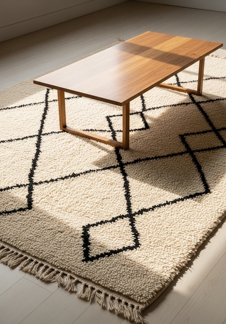 I added a 8×10 Beni Ourain-style rug for graphic black-and-cream contrast. It warms wood floors and reads modern. Try 8×10 beni ourain rug and black diamond throw pillow. Styling tip: keep surrounding tones light for contrast. Mistake to avoid: over-cleaning — natural wool oils help the look.