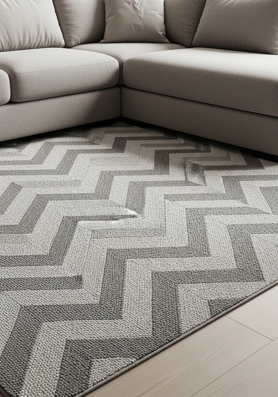 I chose a tonal chevron pattern for movement without loud contrast. It adds directionality and hides minor stains. Try 8×10 grey chevron rug and neutral sofa cover. Styling tip: place the chevron direction toward the main focal point. Mistake to avoid: placing high-gloss furniture that reflects the pattern awkwardly.