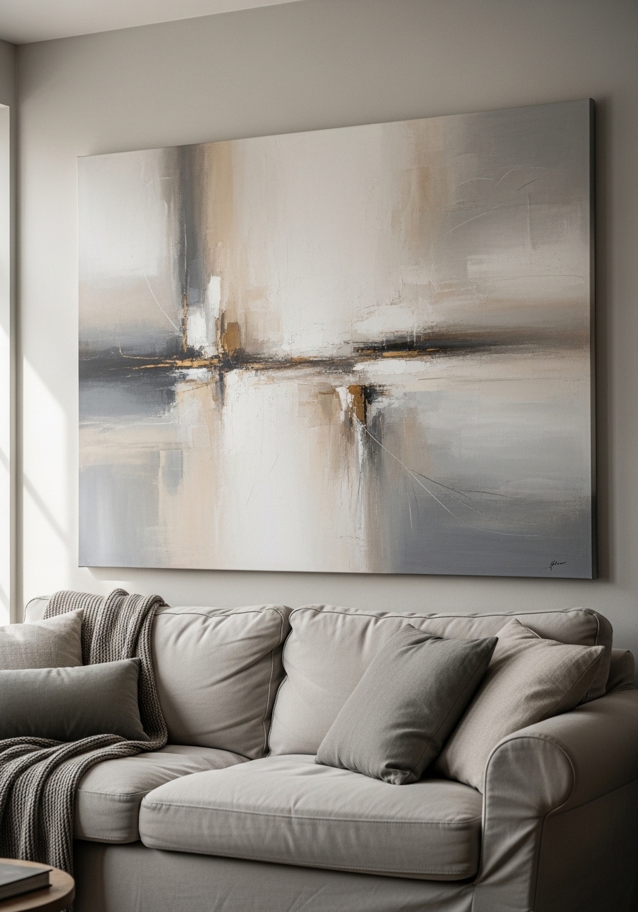 I hung a 48×36-inch abstract canvas and the room finally read as finished. Scale matters. I chose a piece with warm taupe and soft ochre to pick up my throw pillow colors. I bought this large abstract canvas print for about $129 and framed it with a thin black frame from a local shop. Pair it with a slim picture light like this brass LED picture light for evening glow. Styling tip: Hang so the center sits at eye level, about 57 inches from the floor. Mistake to avoid: Choosing art too small for the wall — it will look like a postage stamp.