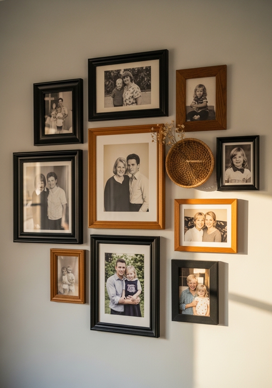 I built a gallery wall with 12 pieces: photos, a small mirror, and a woven tray. I mixed black, gold, and reclaimed-wood frames for contrast. I ordered assorted 8×10 frames for $39 and used removable picture hanging strips to avoid drywall damage. Stylistic rule: Vary frame sizes and anchor with one larger piece. Mistake to avoid: Lining them up too rigidly — galleries need organic spacing. The result feels curated, like a collected history.