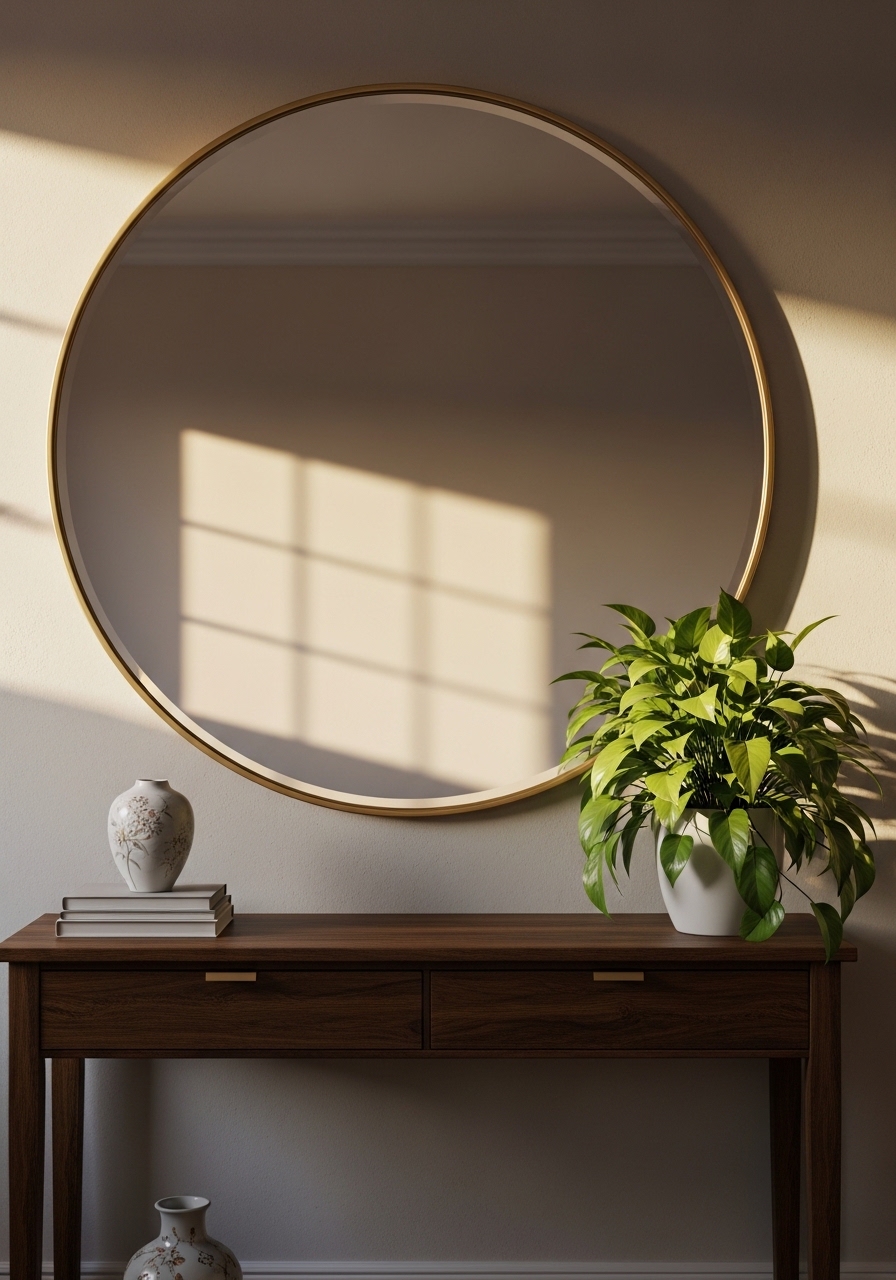Invest in one quality anchor piece: A good mirror or large art piece ($100–300) outlasts trends. 36-inch round mirrors are versatile.