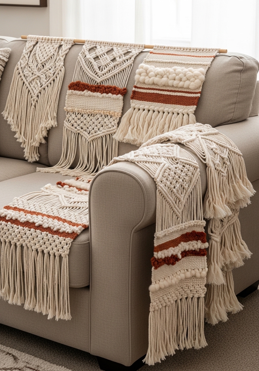 I layered two woven hangings for tactile warmth. A 30-inch macramé piece anchors the sofa without overwhelming. I grabbed woven wall tapestry for $34 and a smaller fringe piece for $18. Styling tip: Stick to a limited color palette — cream, sand, and one accent tone. Mistake to avoid: Mixing too many textures; aim for harmony.