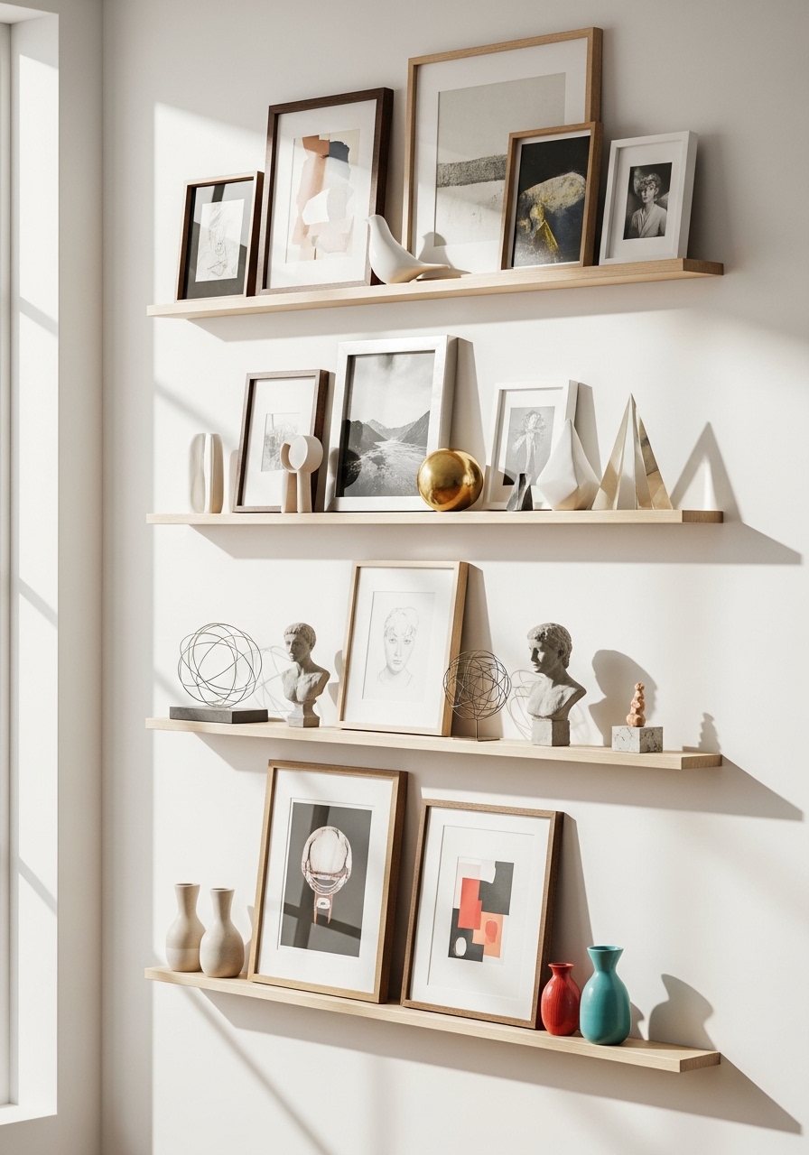 I installed two 48-inch picture ledges and swap prints seasonally. Ledges let you layer art without constant holes. I used 48-inch picture ledges ($42) and framed prints from this print set. Styling tip: Lean larger pieces at the back and smaller items in front. Mistake to avoid: Overloading the shelf weight capacity.