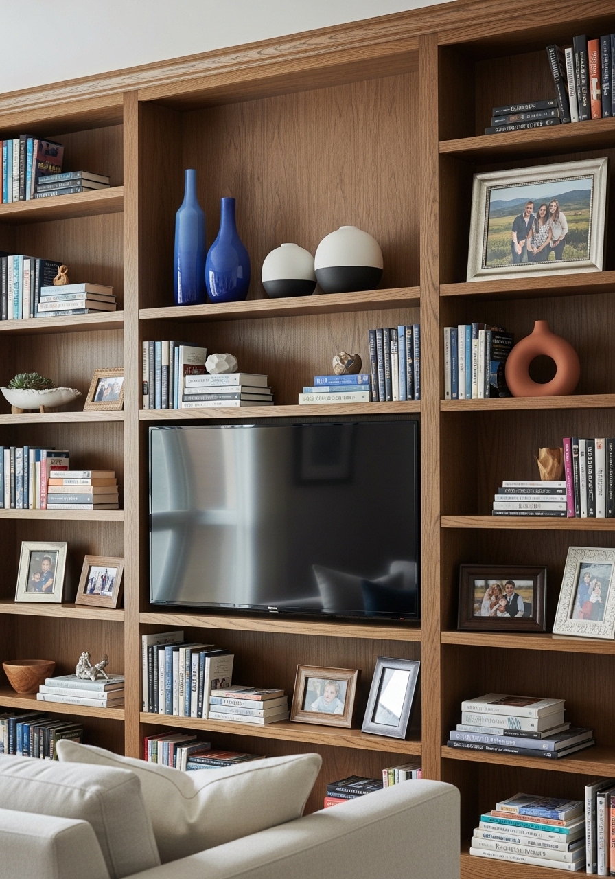 I styled built-ins with books, baskets, and art. I painted the backing a deep navy to make objects pop. I used woven storage baskets ($29 each) and adjustable LED strip lights to highlight shelves. Styling tip: Edit ruthlessly — leave negative space. Mistake to avoid: Lining shelves only with books; mix in objects and art for balance.