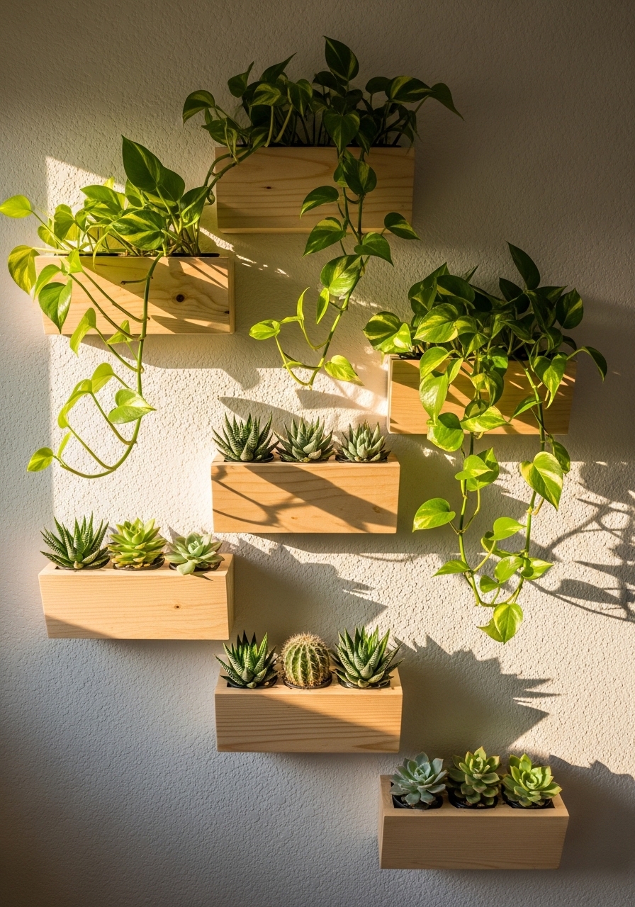 I mounted staggered planters and the living room felt fresher. I used wall planters set ($59) and filled them with pothos and string of pearls. Styling tip: Keep trailing plants in higher pots and upright ones lower for visual flow. Mistake to avoid: Putting high-water plants in tiny pots — they dry out fast.