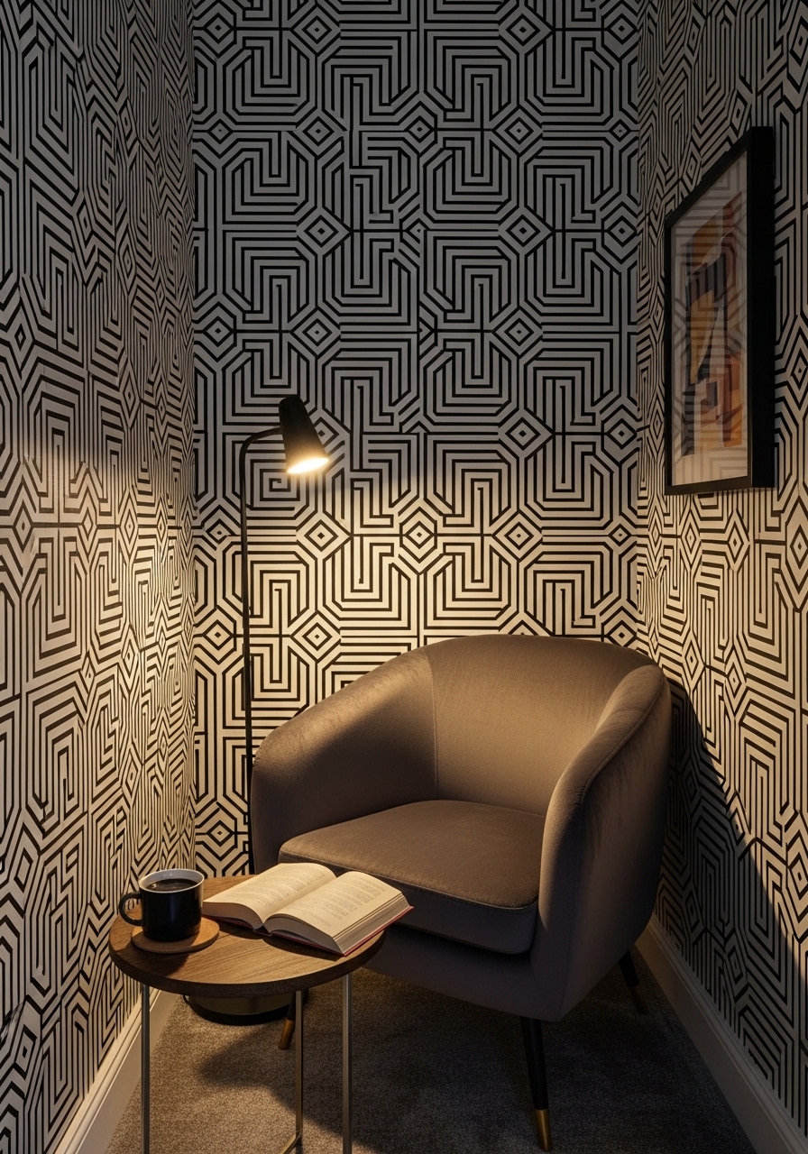 I papered a small nook in a graphic black-and-white print and it created instant drama. I used peel-and-stick geometric wallpaper ($49 roll). It’s renter-friendly and easy to change. Styling tip: Keep furniture neutral against bold prints. Mistake to avoid: Extending busy pattern across large open-plan walls.