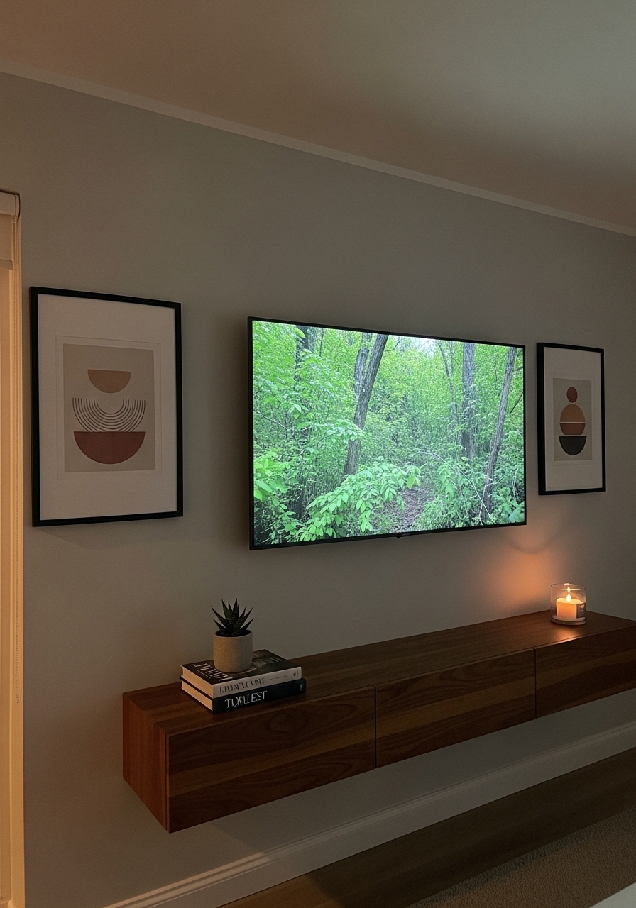 I framed art around my wall-mounted TV to make it feel intentional. Use slim frames and balance with symmetry. I used tv wall mount and slim black frames. Styling tip: Keep colors cohesive with the room palette. Mistake to avoid: Overcrowding — leave breathing space so the TV doesn’t feel boxed in.