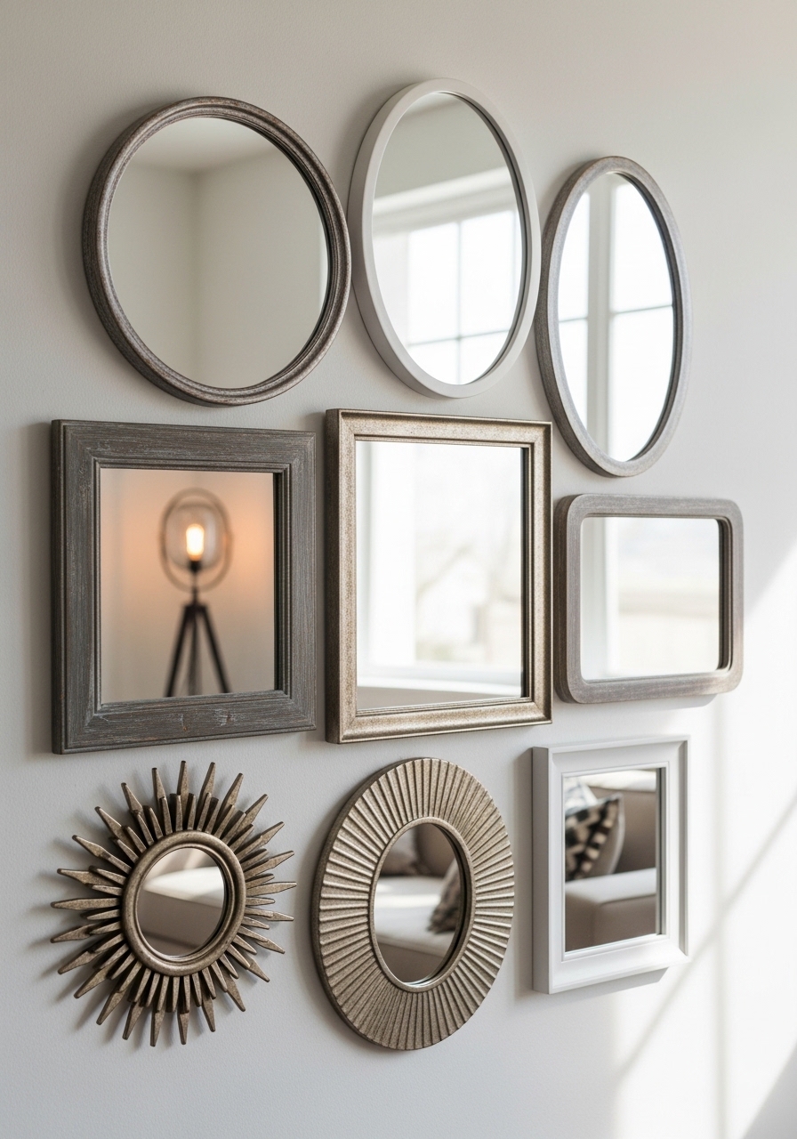 I grouped small mirrors with different frames to add sparkle and movement. The variety keeps it interesting. I used decorative mirror set ($59). Styling tip: Keep at least one anchor mirror that’s larger. Mistake to avoid: Placing mirrors to reflect clutter — aim for pretty reflections.