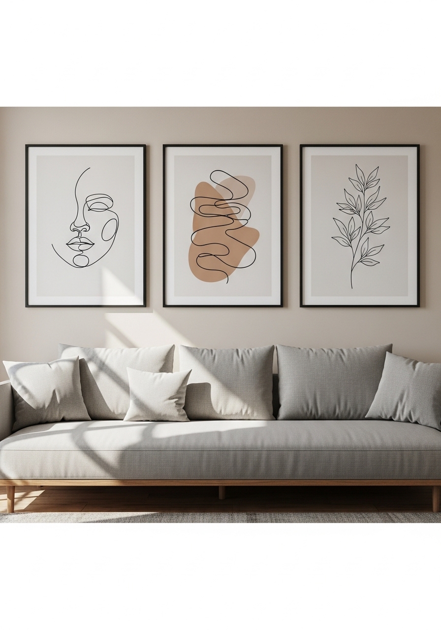 I grouped three line-art prints in identical frames for a calm, curated look. I ordered minimalist line art set ($29) and used 24×18 frames. Styling tip: Keep mats generous for breathing room. Mistake to avoid: Hanging them unevenly — use a level.