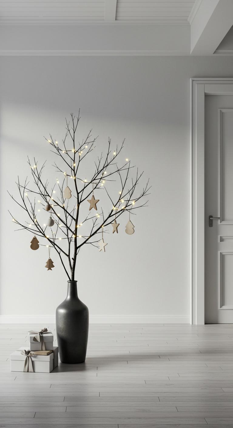 You’ll embrace bare branch aesthetics, hanging a few delicate lights or wooden ornaments.
