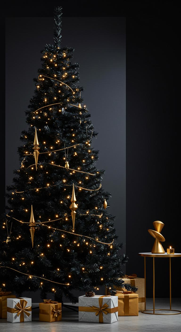 You’ll curate restraint: select a few sculptural ornaments and thin black gold accents garland, add warm white microlights, and keep branches airy.