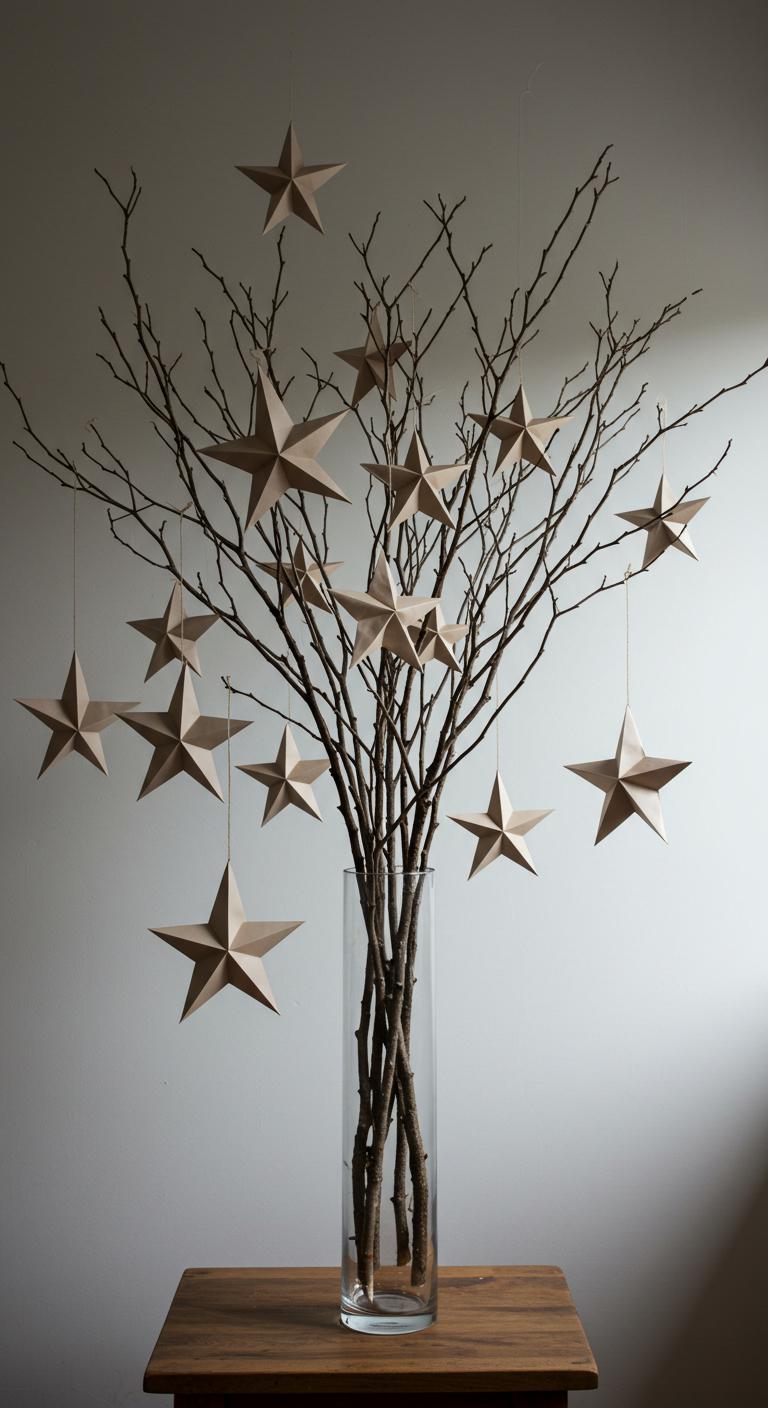 Start with a cluster of bare twigs in a tall vase or mounted branch and hang delicate folded paper stars for an airy, sculptural tree that feels both handmade and modern. You’ll love twig decorations that cast shadow like art; choose varied sizes and neutral tones. Arrange star patterns rhythmically, keep negative space, and let the display feel free, minimal, and effortlessly elegant.