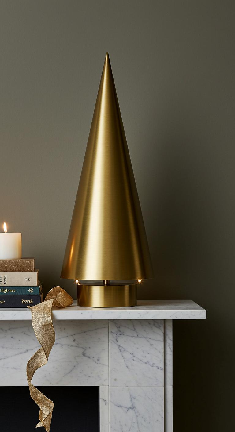 Think metallic geometry when you want a tree that reads modern and minimal; place a sleek cone—brushed brass, matte chrome, or blackened steel—on a mantel or pedestal to create an instant sculptural focal point.